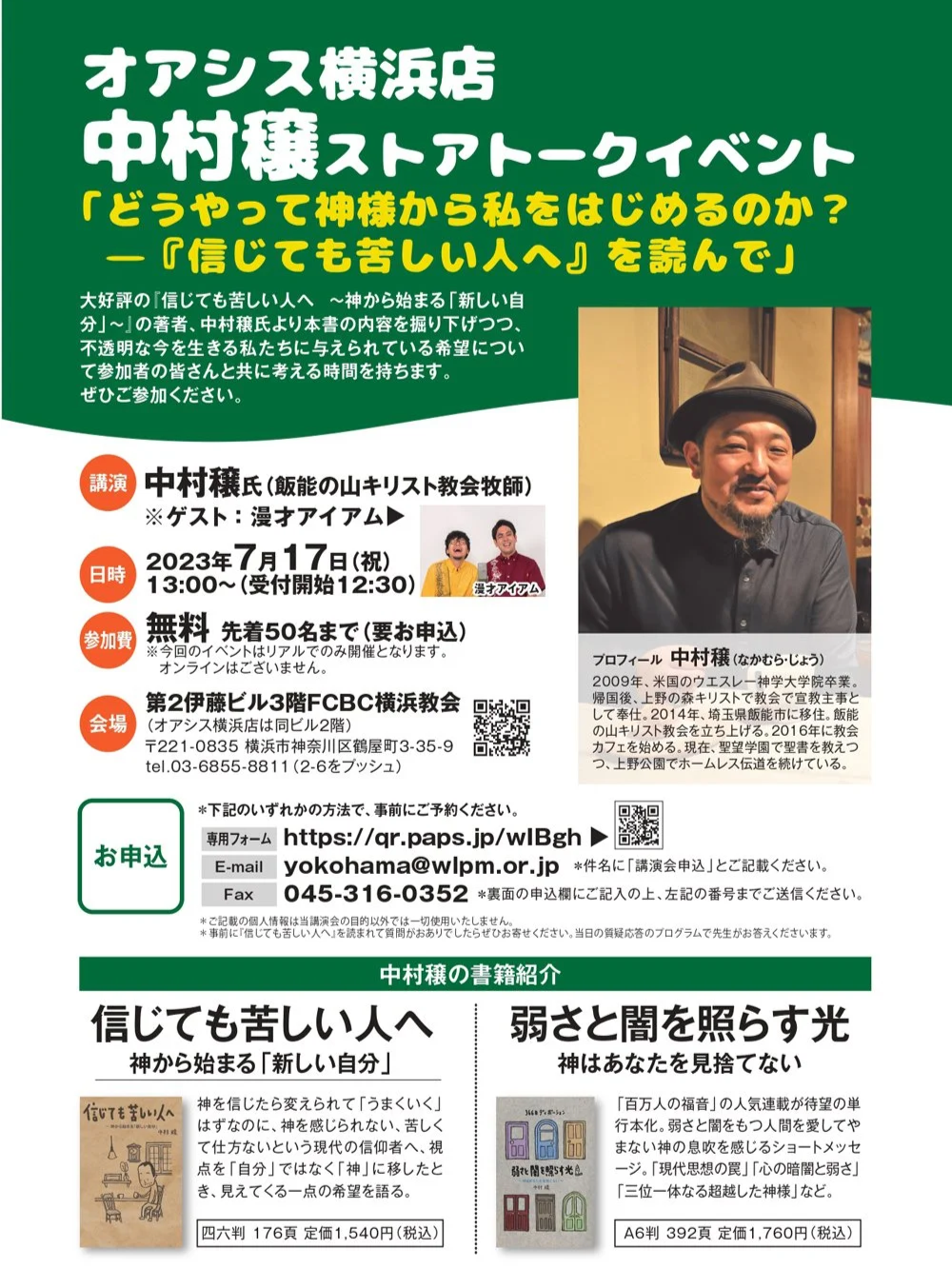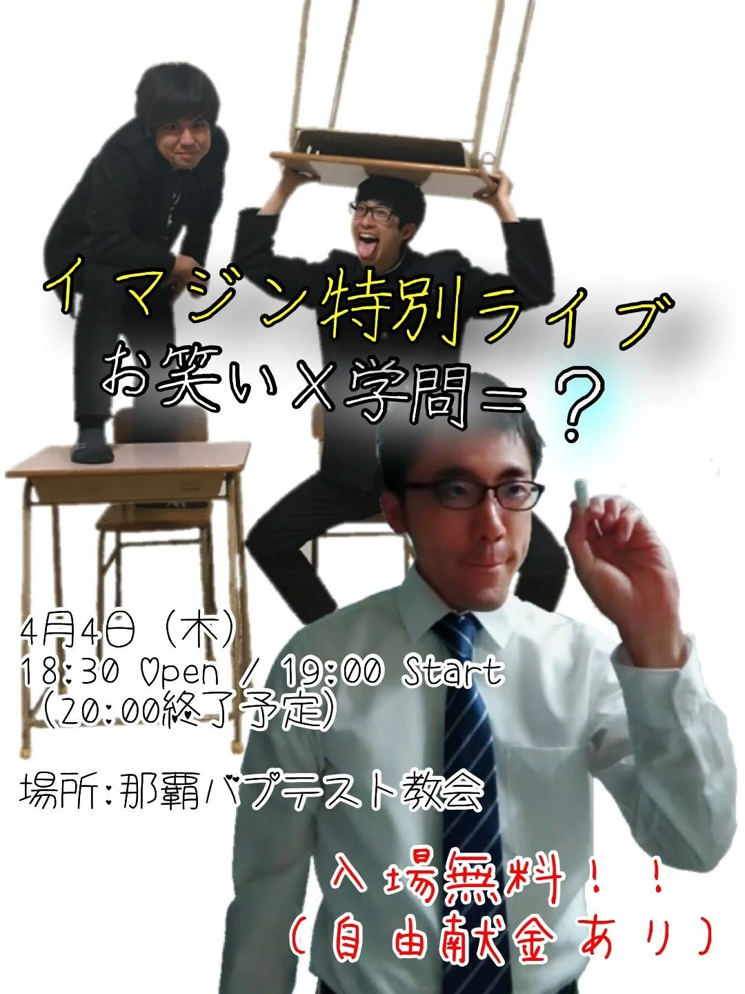 ALL WORKS 2016.12.22第一回イマジン単独ライブ-Christmas eve!eve!!eve!!!-———那覇バプテスト教会 2018.01.05第五回イマジン単独ライブ-ゆとりとさとり-———那覇バプテスト教会 2020.11.27イマジン特別ライブ-笑って学ぶ“今”の過ごし方-———那覇国際高校 2023.01雑誌取材「CHRISTA」———Christian Style 2023.03.24YouTube取材———ぶんでんチャンネル 2023.07.17中村穣トークイベント———オアシス横浜店 2023.08.27福音と笑顔をお届けします!———めぐみの丘チャペル 2023.11.04いのフェス———東北教区センターエマオ 2023.12.10クリスマス会———船堀グレースチャペル 2024.03.23春のお笑いふぇすてぃばる———常盤台バプテスト教会 2024.06.01神は私に笑いを下さいました———ブロッサムチャーチ 2024.05.26「アイアム」奇跡の誕生秘話———いのフェスチャンネル 2017.08.26第二回イマジン単独ライブ-ゾウガメ-———那覇バプテスト教会 2018.04.04イマジン特別ライブ-お笑い×学問=?———那覇バプテスト教会 2022.08.21オンライン夏休み———小禄バプテスト教会 2023.02.25聖書はおもしろい!———与勝バプテスト教会 2023.03.26オープンチャーチ———嘉手納教会 2023.07.23テレビ出演「ライフライン」———太平洋放送協会 2023.09.10ラジオ出演「世の光」———太平洋放送教会 2023.11.11アイアム特別ライブ———秋川キリスト集会 2023.12.10こどもクリスマス会———小岩栄光キリスト教会 2024.04.20第一回アイアム単独ライブ-創めの一歩-———Philia Cafe 2024.06.02アイアムインタビュー———たまものクラブ 2024.11.16創作を継続するためのマインド———まりしゅん 2017.12.29第三回イマジン単独ライブ-忙しい時期にすいません-———那覇バプテスト教会 2019.07.22-ライブ出演「トンガリ」———なかの芸能小劇場 2022.11.05落語で聞く聖書のお話———那覇バプテスト教会 2023.02.26アイアム特別ライブ-ウクライナ被災者支援-———ハンガーゼロ 2023.04.29教師研修会———聖マタイ幼稚園 2023.08.08-2023.08.17OBC小学科キャンプOBC中高生キャンプ———奥多摩バイブルシャレー 2023.10.21お笑いとアーティスト———龍ヶ崎市文化会館 2023.11.18キリスト教保育連盟60周年記念大会———胡屋バプテスト教会 2023.12.23Christmas Party 2023———OBJ 2024.05.19ペンテコステアイアムお笑いライブ———茂原キリスト教会 2024.02アイアム対談———たいわタイムradio 2018.08.17第四回イマジン単独ライブ-楽しかったです!また行きたいです!-———那覇バプテスト教会 2020.09.17ライブ出演「IT’S 笑 TIME」———配信限定 2022.11.19TCU支援会コンサート&スペシャル対談———ライフセンタービブロス堂 2023.03.13書籍漫才-信じても苦しい人へ-———ぶんでんチャンネル 2023.05.05こどもふれあいイベント———くくる糸満 2023.08.19手話フェス———飯坂温泉街「旧堀切邸」 2023.10.27オータムフェスタ———淀橋教会 2023.12.03子どもクリスマス会———東京カベナント教会 2024.02.27ラジオ出演「WTP」———太平洋放送教会 2024.05.26オープンチャーチお笑いライブ———原町田教会 2024.02クリスチャン新聞福音版———クリスチャン新聞